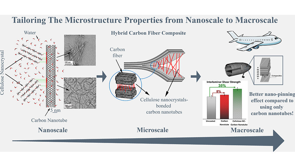 “In this study, we have taken the approach of designing the composites from the nanoscale using cellulose nanocrystals. This method has allowed us to have more control over the polymer composites’ properties that emerge at the macroscale,” said Asadi. “We think that our technique is a path forward in scaling up the processing of hybrid composites, which will be useful for a variety of industries, including airline and automobile manufacturing.”