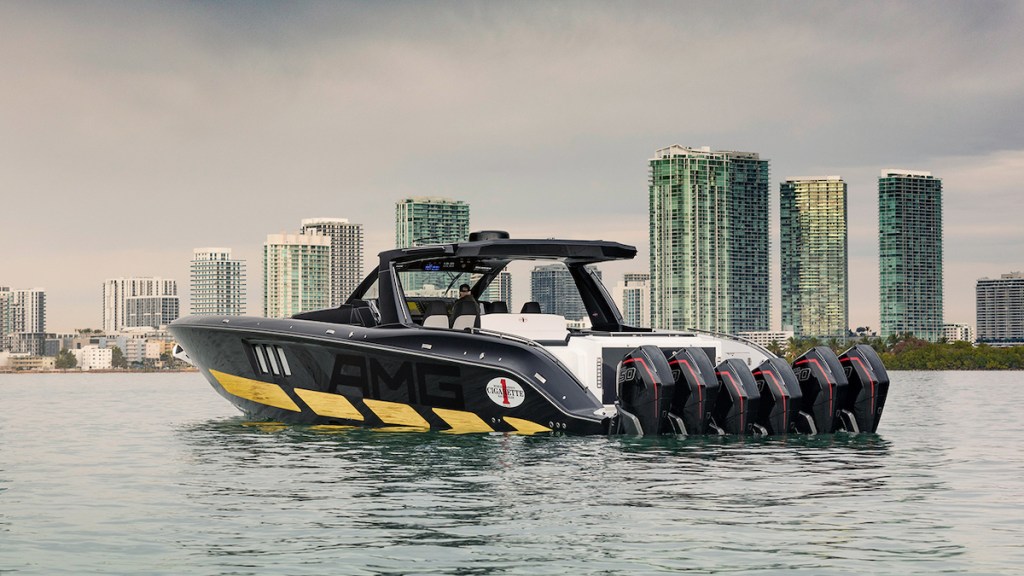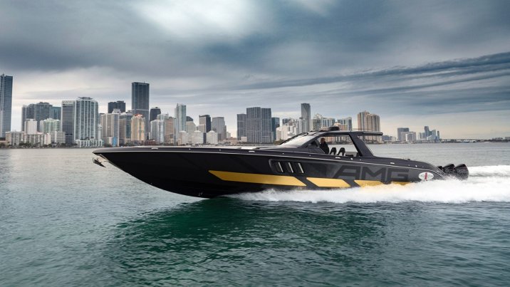 The high-performance boat is based on the Cigarette Racing Team’s 59-foot Tirranna and has been built in partnership with Mercedes-AMG engineers.