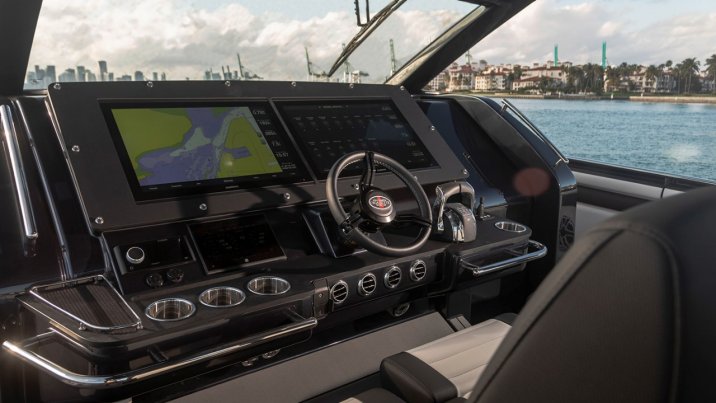 The boat’s construction has been focused on using lightweight materials, Its raked hardtop is made completely of carbon fibre, reducing the vertical centre of gravity for better handling, while carbon fibre also features throughout its superstructure, with carbon-capped stringers and a carbon-fibre transom. The hull and deck are vacuum infused using a composite laminate schedule with PVC coring. The instrument panel is a nano-coated solid surface that is anti-reflective and heat-resistant, which also features titanium fasteners.