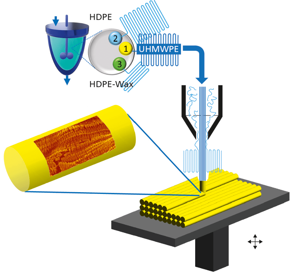 The addition of fillers does have a negative impact on the cost and the energy, raw material, environmental balance: production and recycling are considerably more difficult and expensive. So-called ultra-high molecular weight Polyethylene or UHMWPE for short, used as a high-performance material in medical implants such as acetabular cups or knee joints, offers an alternative. However, this pure, high-strength and abrasion-resistant material cannot be processed by injection moulding: It has to be pressed into a mould as a powder, sintered and then milled into the exact component in a complex and cost-intensive process. Although UHMWPE fibres can achieve the strength of steel, they are expensive and unsuitable for material recycling.