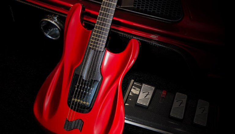 The new candy apple red electric guitar has been modelled around the Saleen 1 sports car and features a hollowed carbon-fibre body with a roasted alder centre block and hand-carved maple top. The neck has a carbon fibre round-lam fingerboard topped off with a matching carbon fibre headstock overlay.