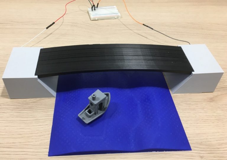 The concept was proven by Brightlands Materials Center by monitoring deformation in a simple bending beam and in a scale model of a pedestrian composite bridge. Both were printed with an Anisoprint A4 Composer which allows full freedom of the carbon fibre layout and material choice. This is specifically important for sensing because carbon fibre has to stick out of the part to be able to make connections to the monitoring electronic hardware.