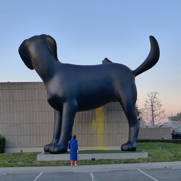 A huge 28 ft tall sculpture of a black labrador doing its business on the side of the Orange County...