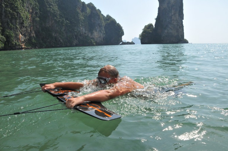 This is the Subwing, invented by Simon Sivertsen in 2010 the subwing works in a similar way to a fish fin, pressing the leading edge of the device down will cause the rider to dive, pulling up will make the rider surface and twisting it left or right will change direction – at least as much as the 15 feet of rope that you are being towed behind the boat will allow.
