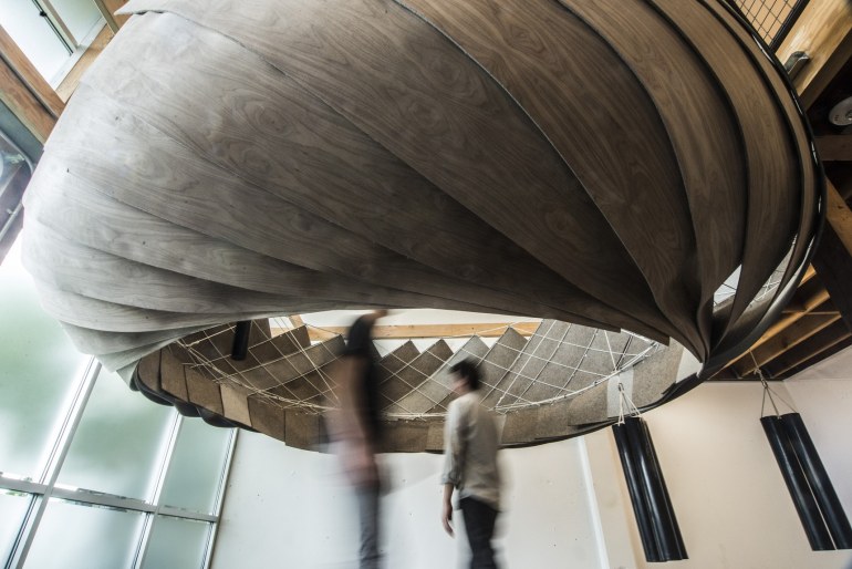 The MIT School of Architecture’s Self-Assembly Lab has teamed up with Google to create Transformable Meeting Spaces, a project that utilizes woven structure research in wood and fiberglass pods that descend from the ceiling, transforming a large space into a smaller one. Designed as a small-scale intervention for reconfiguring open office plans—which “have been shown to decrease productivity due to noise and privacy challenges”—the pods require no electromechanical systems to function, but rather employ a flexible skeleton and counterweight to change shape.