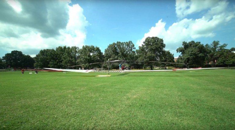 Constructed from balsa wood, foam, mylar and carbon fibre, the Gamera helicopter has been designed into a giant x formation with the pilot seated in the centre. Attached to the end of the 60 feet long arms is a 42-foot rotor.