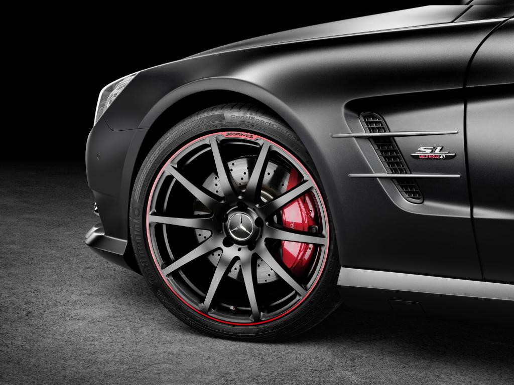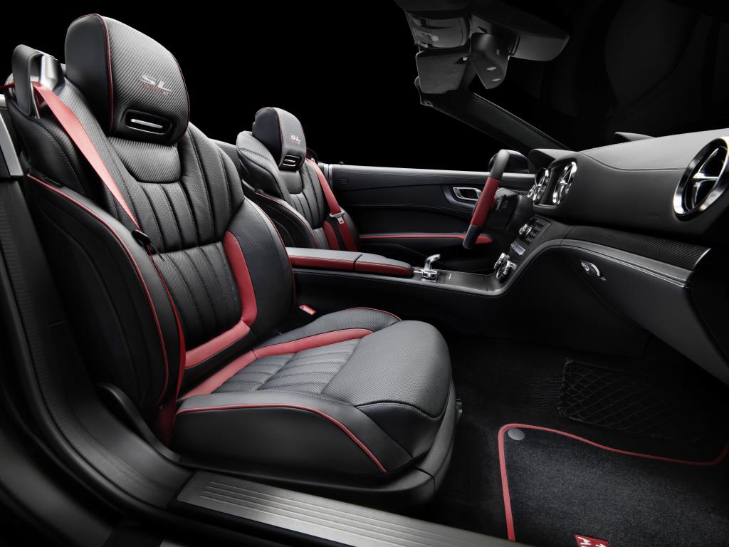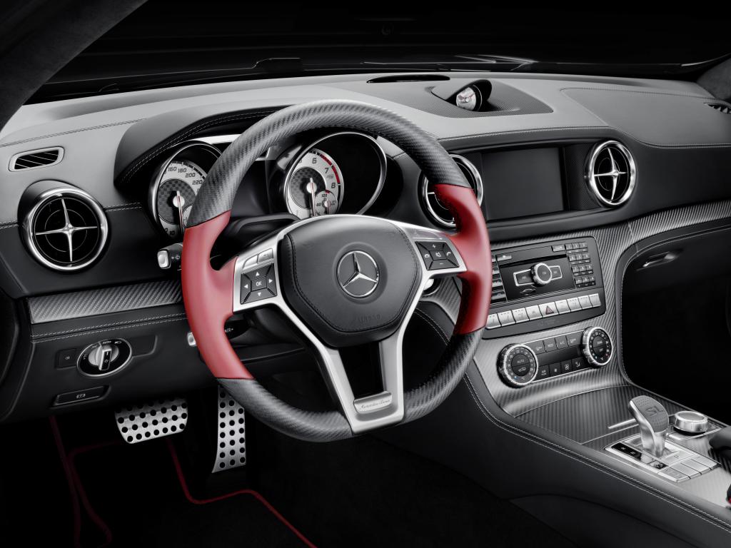 On the inside Mercedes has further upgraded the cockpit with high quality materials and german craftsmanship. The AMG lined seats and leather headrests sport an embossed carbon structure and an embroidered “SL Mille Miglia” label. Red edging also outlines the black door centre panels with red armrests. The easy-to-grip steering wheel is wrapped in red and black nappa leather with sporty embossed carbon structures.