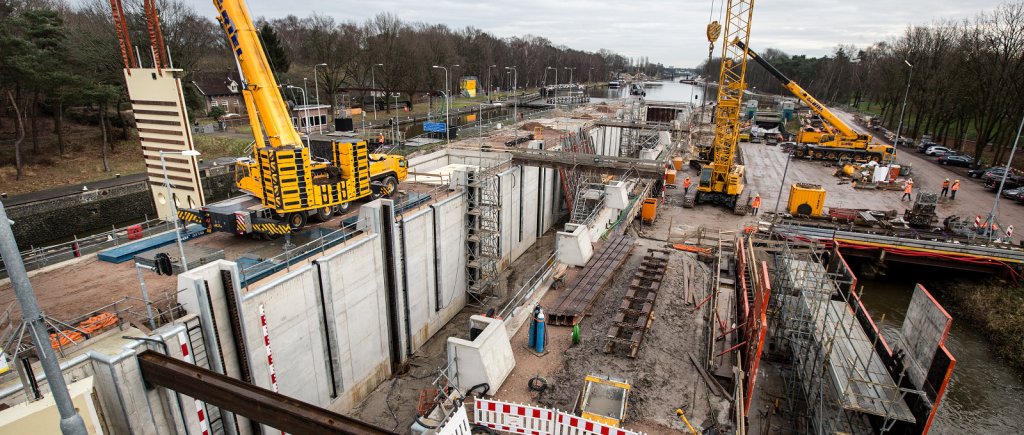 As part of the larger project, the existing locks II and III are replaced by a single new lock. Also, new sheet piling is installed along the canal sides and a more environmentally banks are being developed.