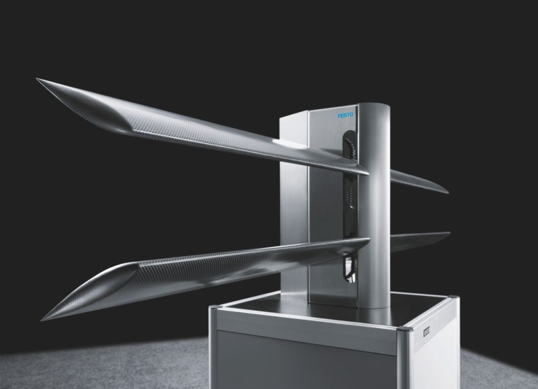 The inventors at Festo have developed an extraordinary technology platform that uses two pairs of horizontally arranged carbon fibre wings instead of rotor blades to generate power. The principle consists of reversing the natural wing-beating principle: birds generate the necessary power to move forwards in the air by flapping their wings.