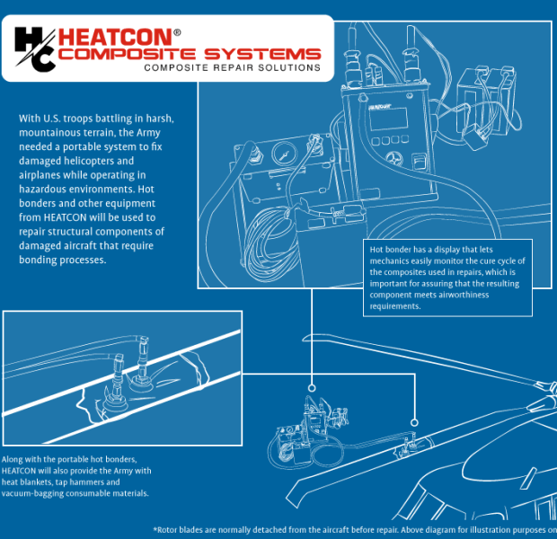Hot bonders and other equipment from Heatcon will be used to repair structural components of damaged aircraft that require bonding processes. The company is providing the Army with nearly 200 portable hot bonders, which will be used to repair the composite structures on military aircraft.
