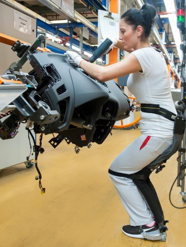 The high-tech carbon-fibre construction allows employees to sit while working, improving posture and reducing strain on their legs.